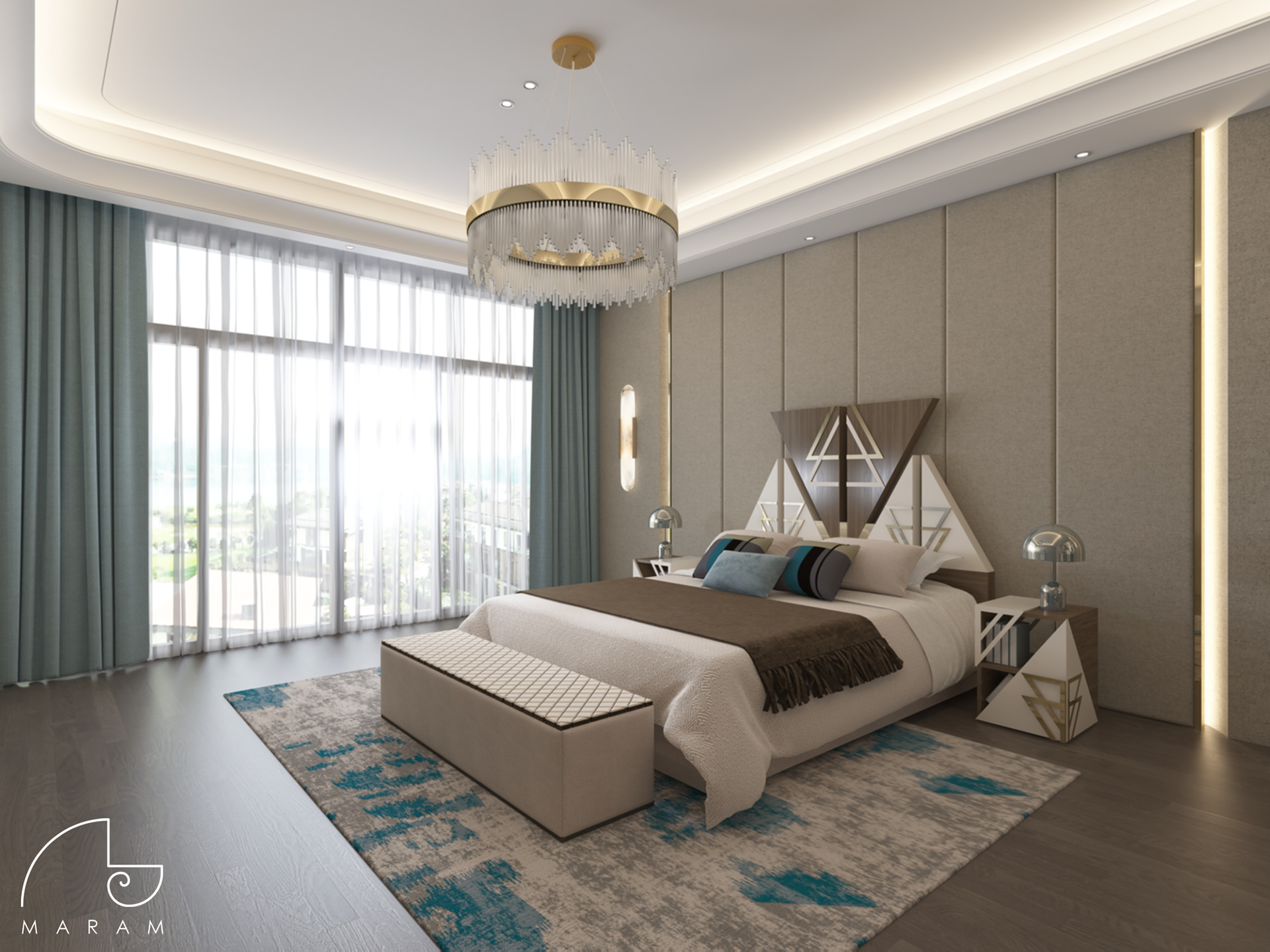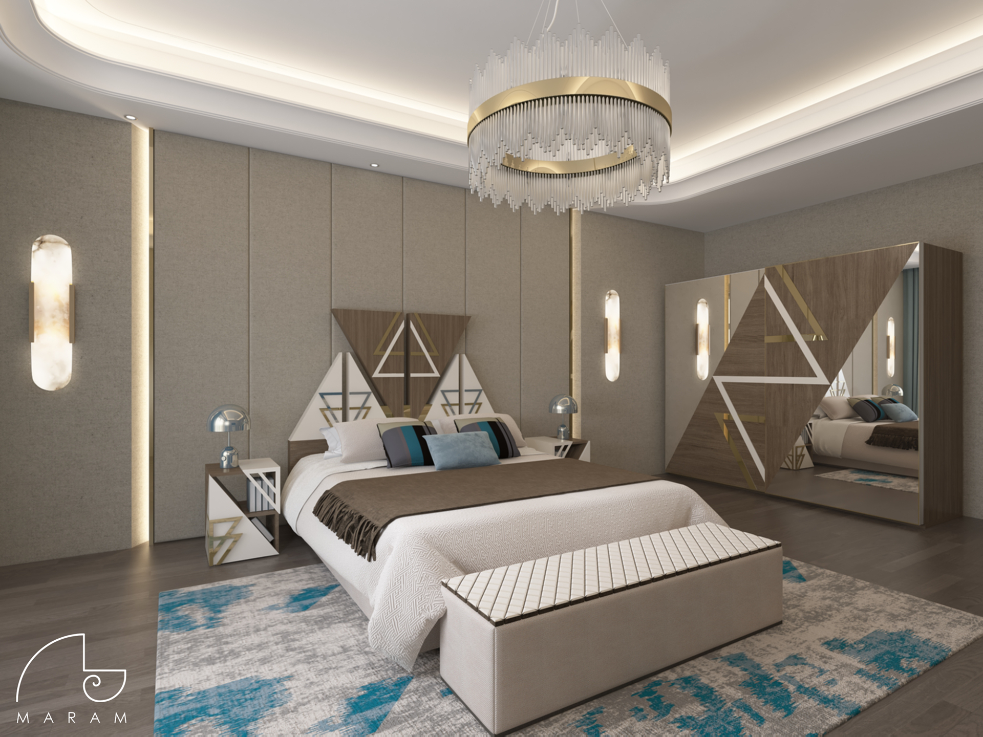 The goal of the project was to create a custom-made full furniture bedroom set, including side tables, a wardrobe and the bed headboard, by using abstract geometry as design elements.
