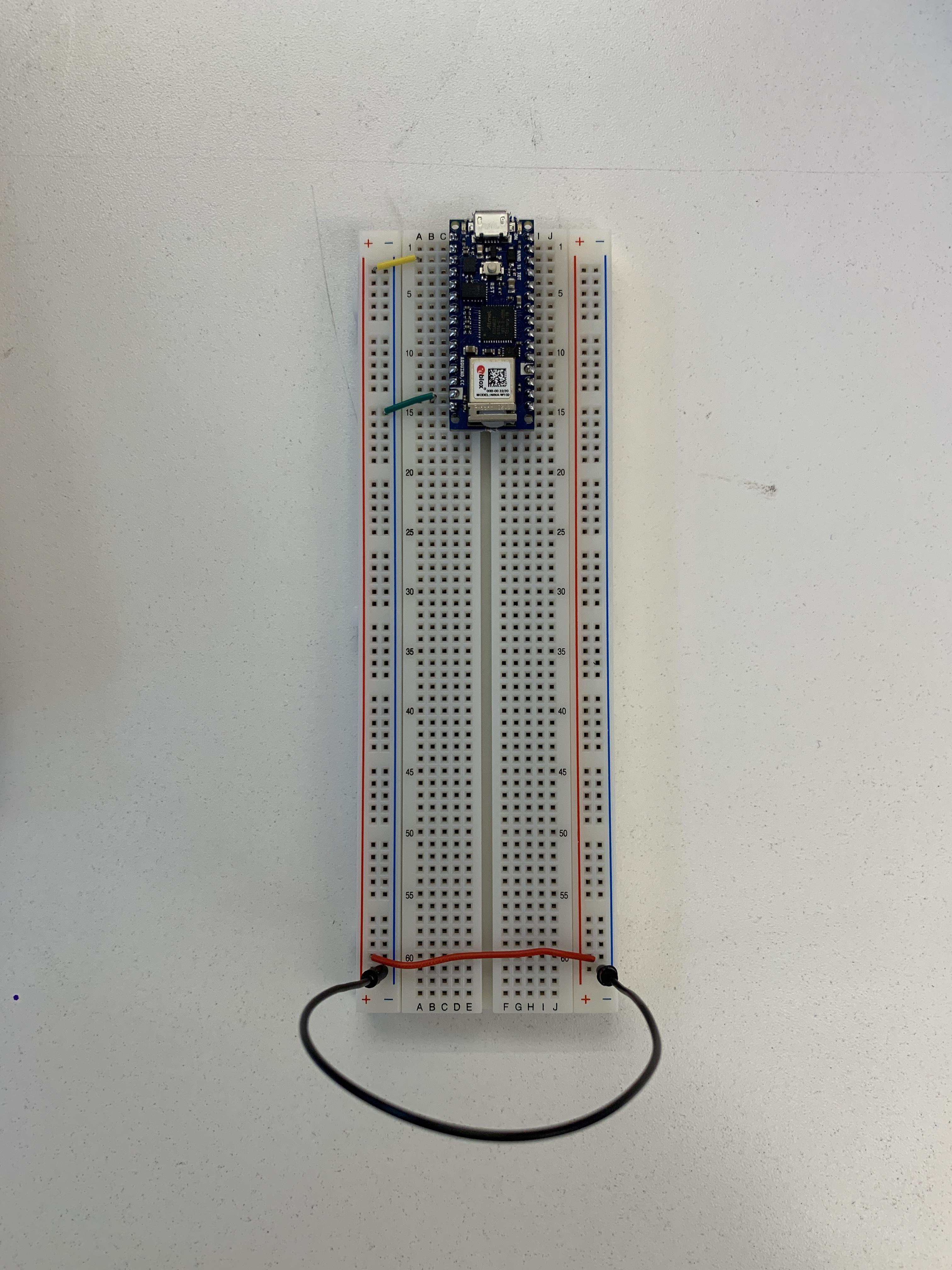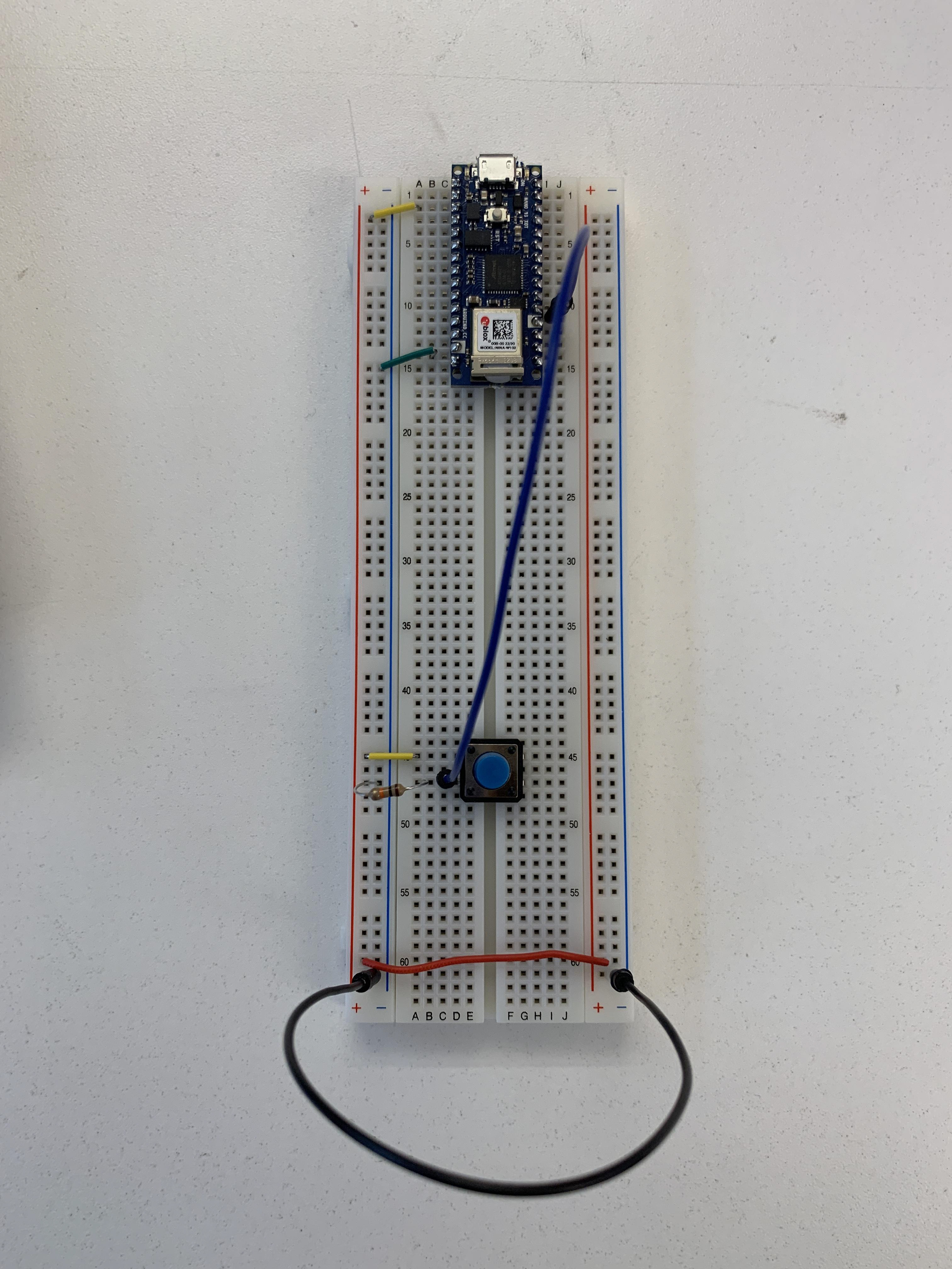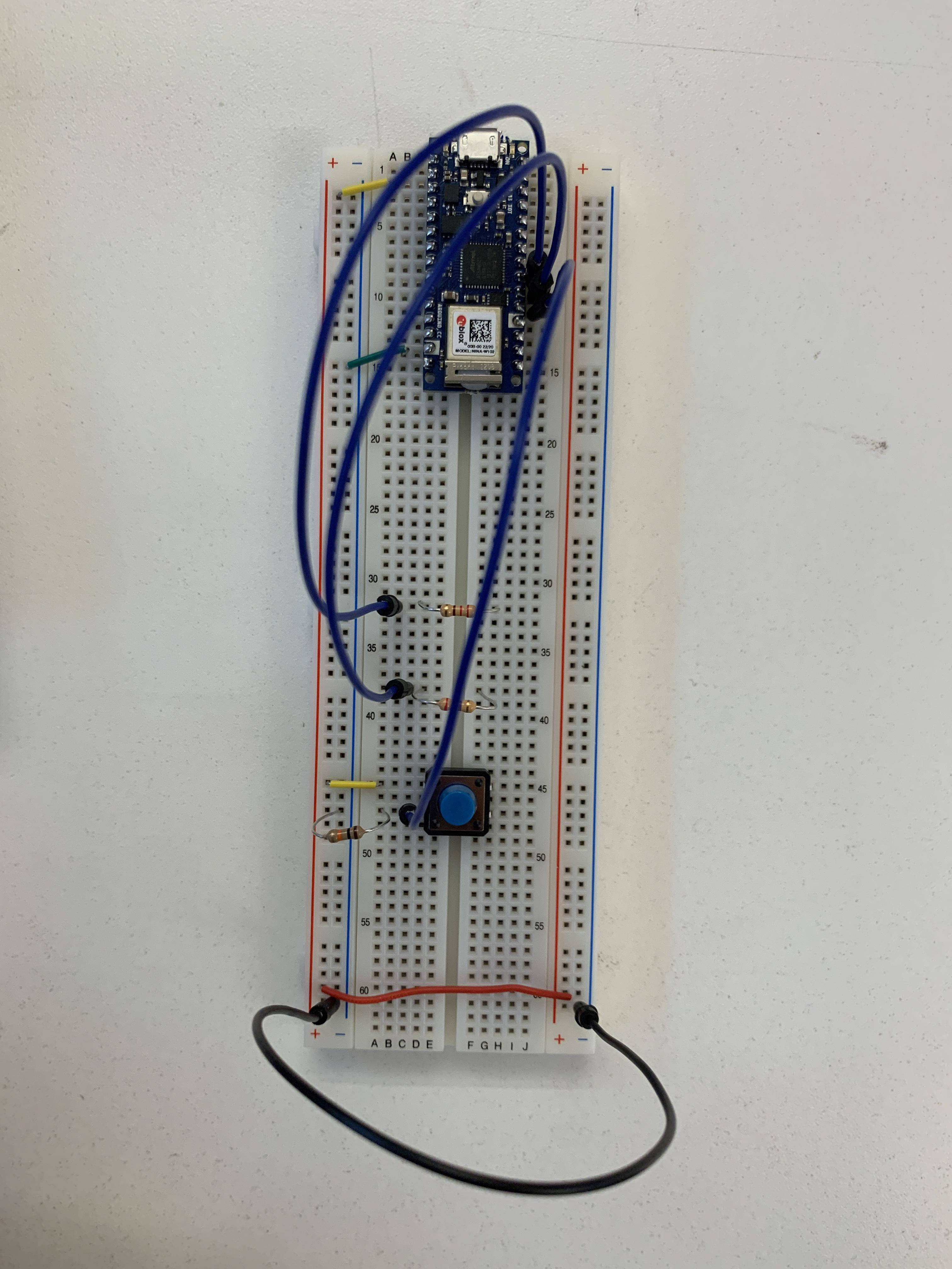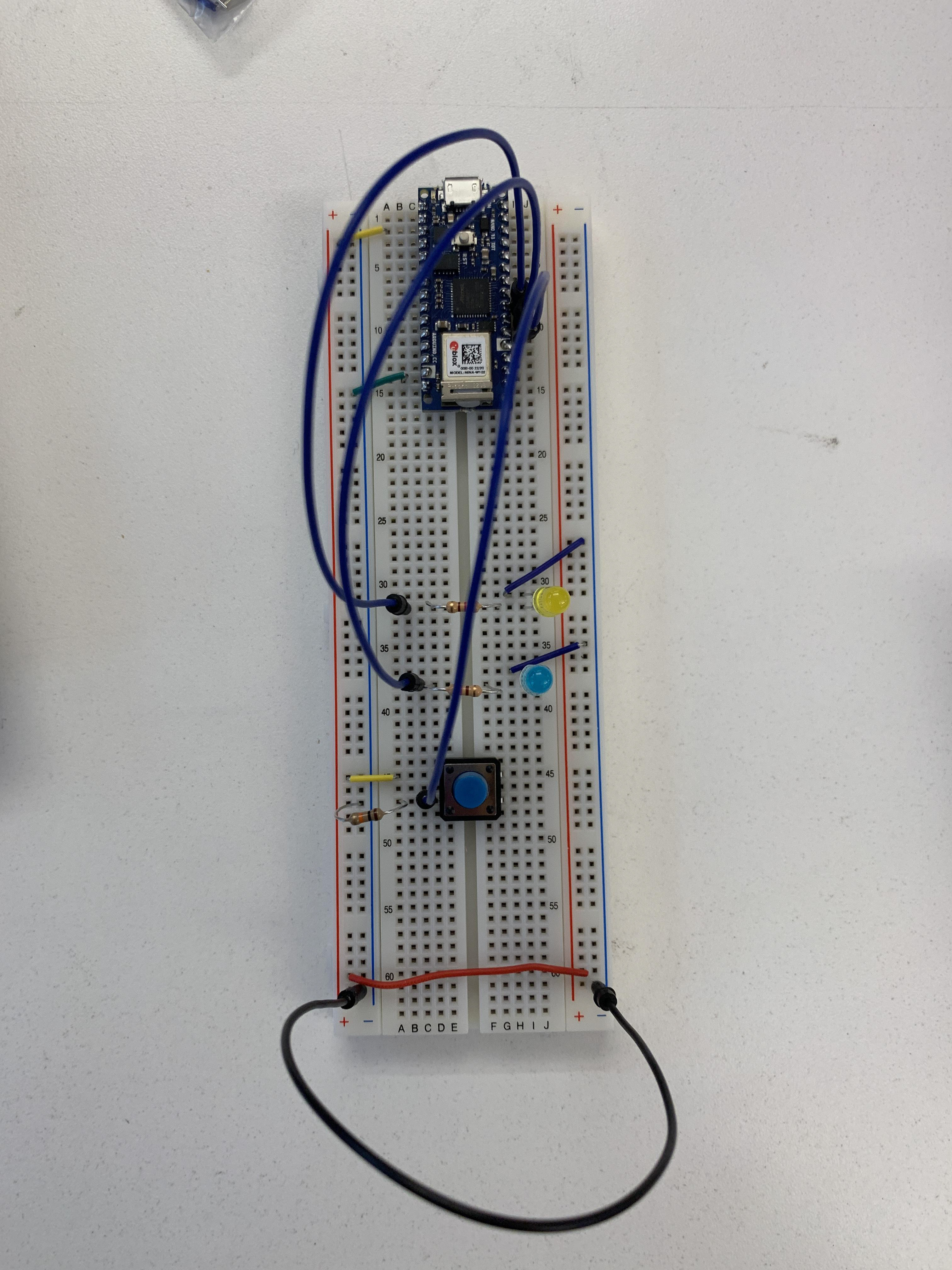 The following are images of how the setup for the circuit was done, including an Arduino NANO 33 IOT, a breadboard, push button, LEDs, resistors, and jumper wires.